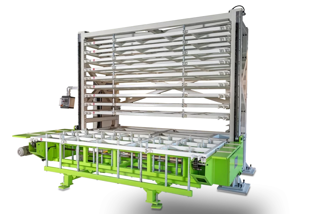 CIDAN Stackmaster: un sistema de almacenamiento flexible, rápido y que ahorra espacio para láminas cortadas a medida y piezas cortadas o perforadas con láser. Está equipado con 10, 15 o 20 bandejas controladas a través del sistema de control.